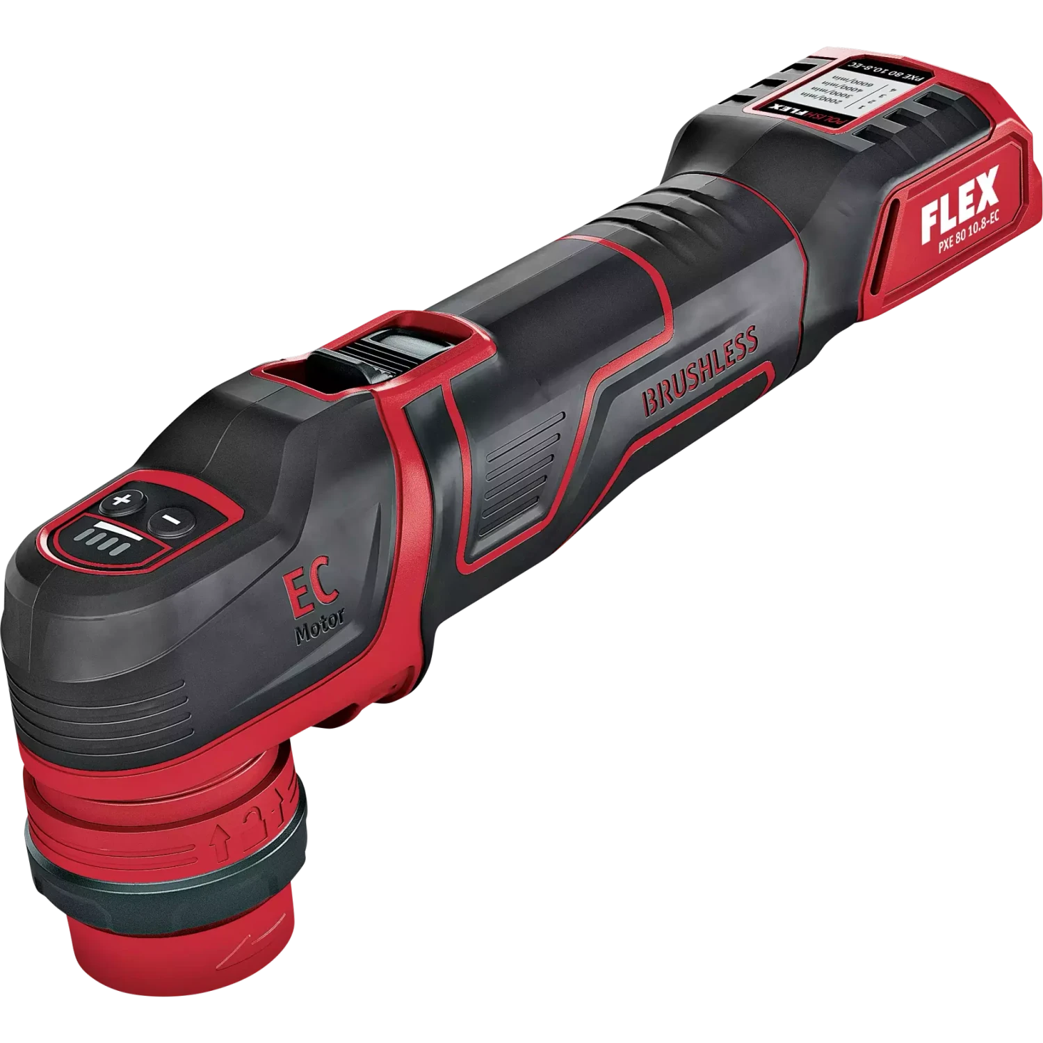 The smart cordless polisher 10,8 V, rotary and random orbital free-running + Innovative, toll-free quick-change system for the exchange of drive types rotary and random orbital + For rotary and random orbital free-running work with 3 and 12 mm stroke + Flexible and easy as never before from spot sanding to finishing without creating any holograms with one tool + The ideal complement device for every vehicle finisher, varnisher and the spot repair area + Continuous speed control trigger: for a gentle start and a lock-on for continuous operation + Features constant speed control and four speed stages, Display by LED clearly visible + Perfect ergonomics and flexible grip options because of ist ideally placed softgrip surfaces + Vibration optimization for smoother operation + Cushioned special velcro pads for polishing and grinding + Shock protection ring to protect surfaces + Brushless motor with greater efficiency and a longer service life + Electronic management system (EMS) protects the machine, extends the service life, and increases efficiency + LED battery capacity display + FLEX battery system: suitable for all 10,8 V battery packs Â