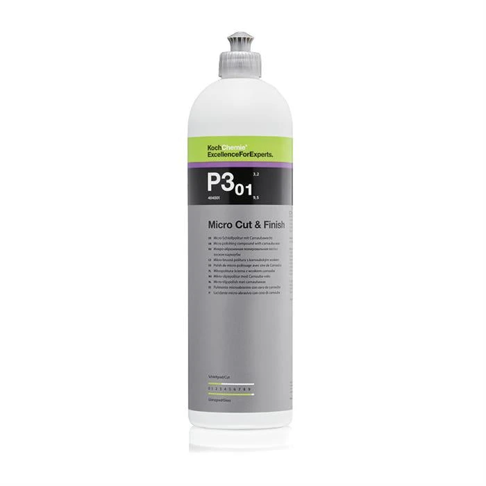 scratch-resistant) with simultaneous long-term sealing with high degree of gloss and smoothness. Through the use of highly specialised, extremely homogenous abrasive bodies, a brilliant permanent high gloss finish is created under extreme light conditions even on dark and similarly sensitive shades. Holograms and fine scratches are eliminated mechanically and not, which is often the case, covered over. Micro Cut & Finish is economical, easy to polish and to remove. Contains carnauba wax and non-fugitive silicones.